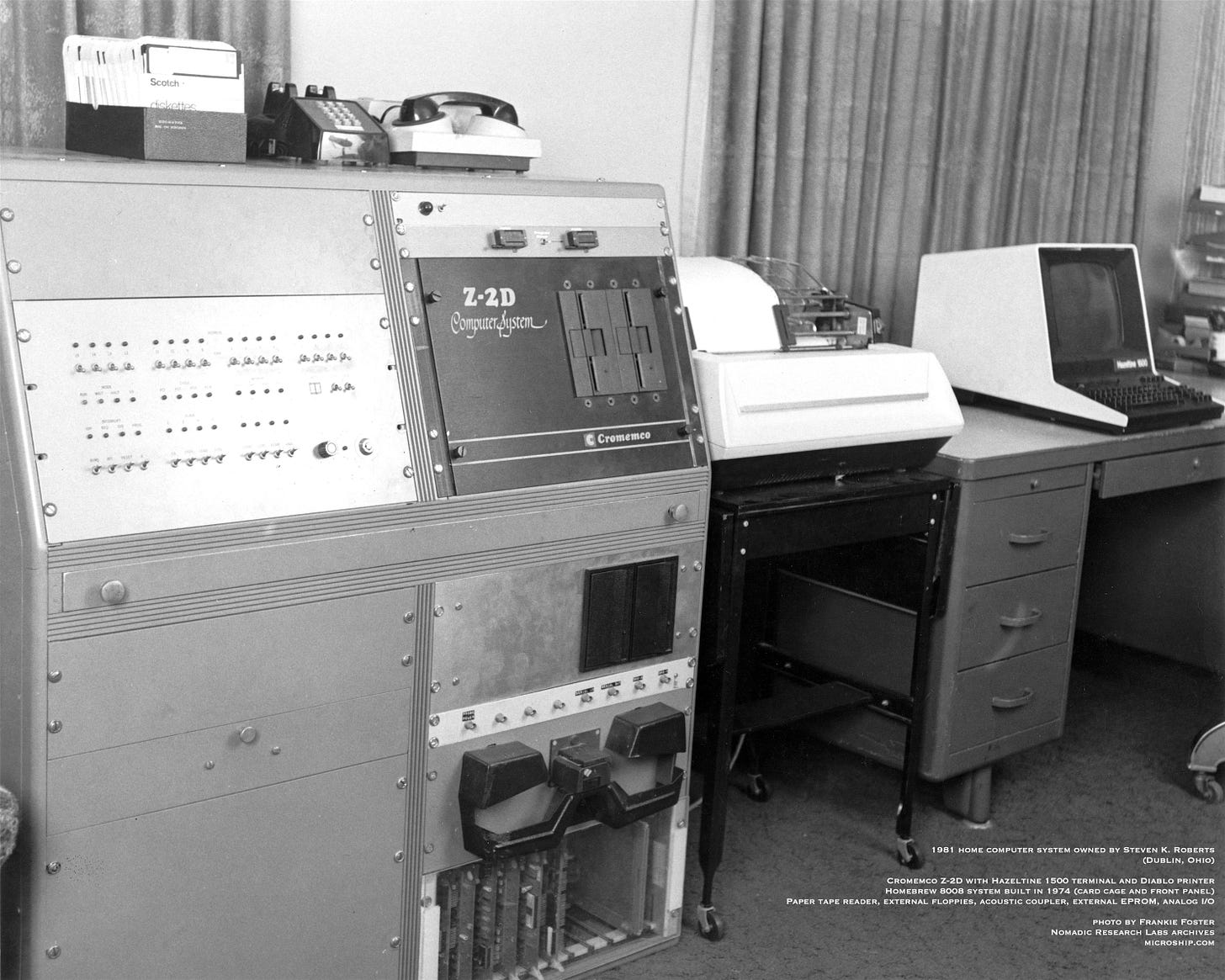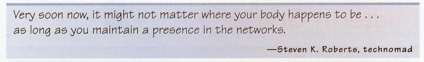 But in 1983, I was chained to my desk like everyone else, pounding away on WordStar, trying to hit keys in the right order so people would send me money. I was just shoving bits around, yet computers were huge, phones were hardwired to the wall, and long-distance charges were horrific (about $350/month). Sharing a project required face-to-face interaction, so collaborations were limited to neighbors unless there was the time to drive or money to fly. Everybody had folders of faxes and nth-generation photocopies, and exotic “online information retrieval” tools were a dollar-a-minute or more.