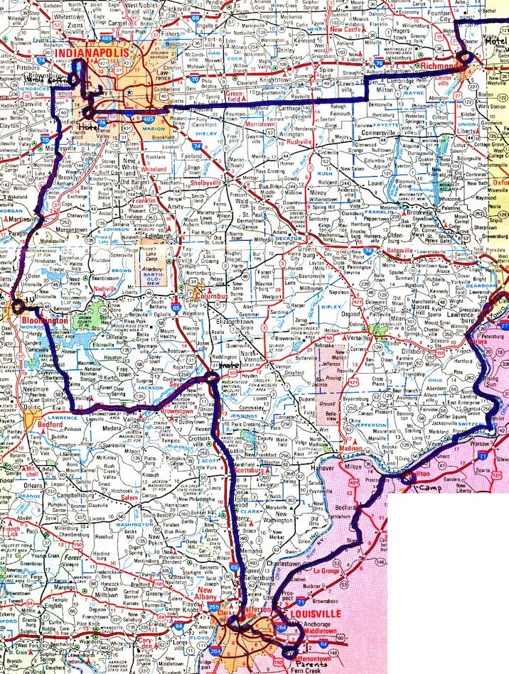 And then: the road! It felt like a beginning as I pedaled west out of Clermont and turned south to begin the headwind death march to Bloomington. The wind blew from the southwest with such force that I had to struggle in my almost-granny gear to progress on level ground. Minor hills were grueling from my out-of-shape perspective of the time, and traffic was unsympathetic. A jovial bald druggist in Plainfield sold me a knee support, and a drunk in Martinsburg told me I was outta my mind.