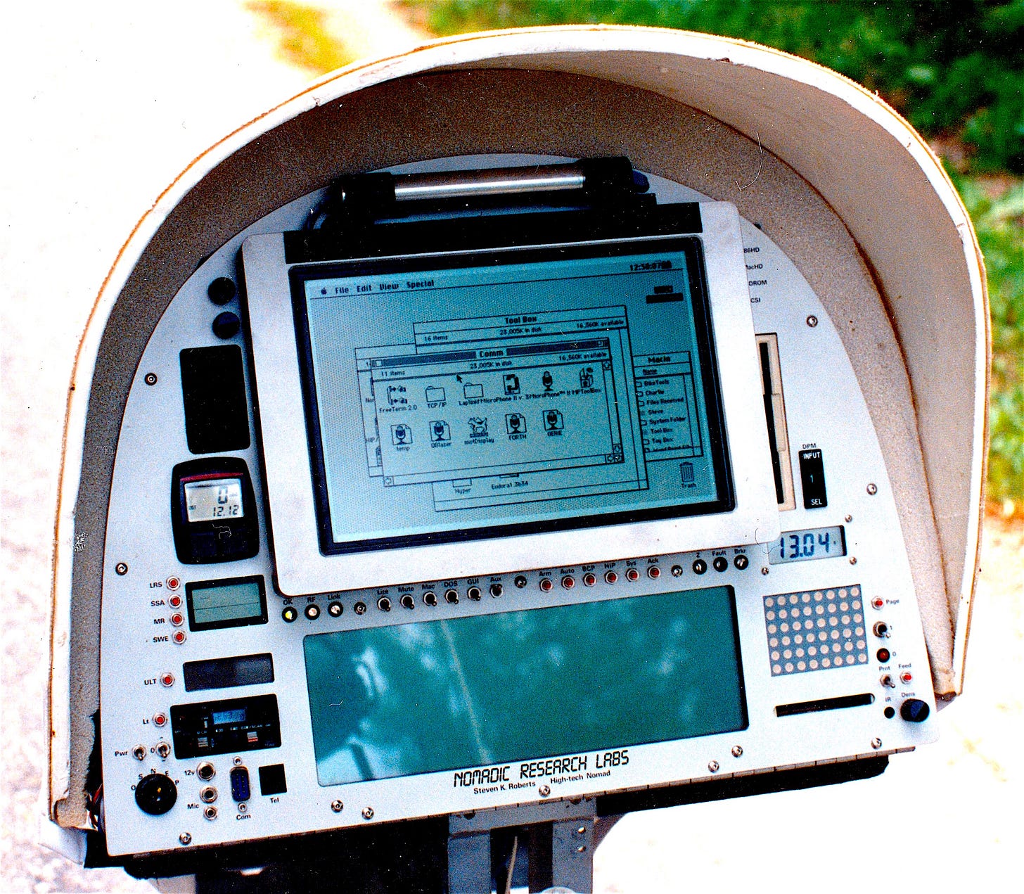 This 105-speed machine had satellite email, IP connectivity via cellular, 82 watts of solar panels, console Macintosh and SPARCstation, active helmet cooling, a robust multimode ham radio station, heads-up display, ultrasonic head mouse, crosspoint audio switching, and a trio of bicycle control processors running under a HyperCard front end. It was insanely heavy at 580 pounds (loaded), so had a 7.9-inch ultra-granny along with pneumatically deployed landing gear to allow me to crawl uphill. There was technology to compensate for the weight of the technology… and I learned that if you take an infinite number of very light things and put them together, they become infinitely heavy!