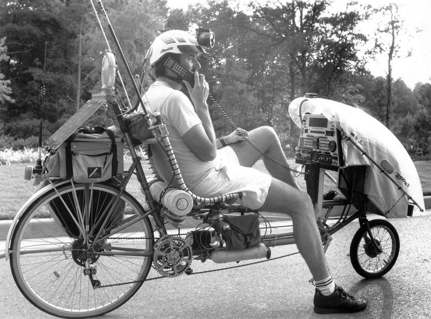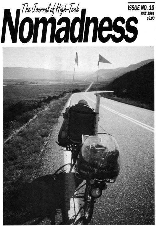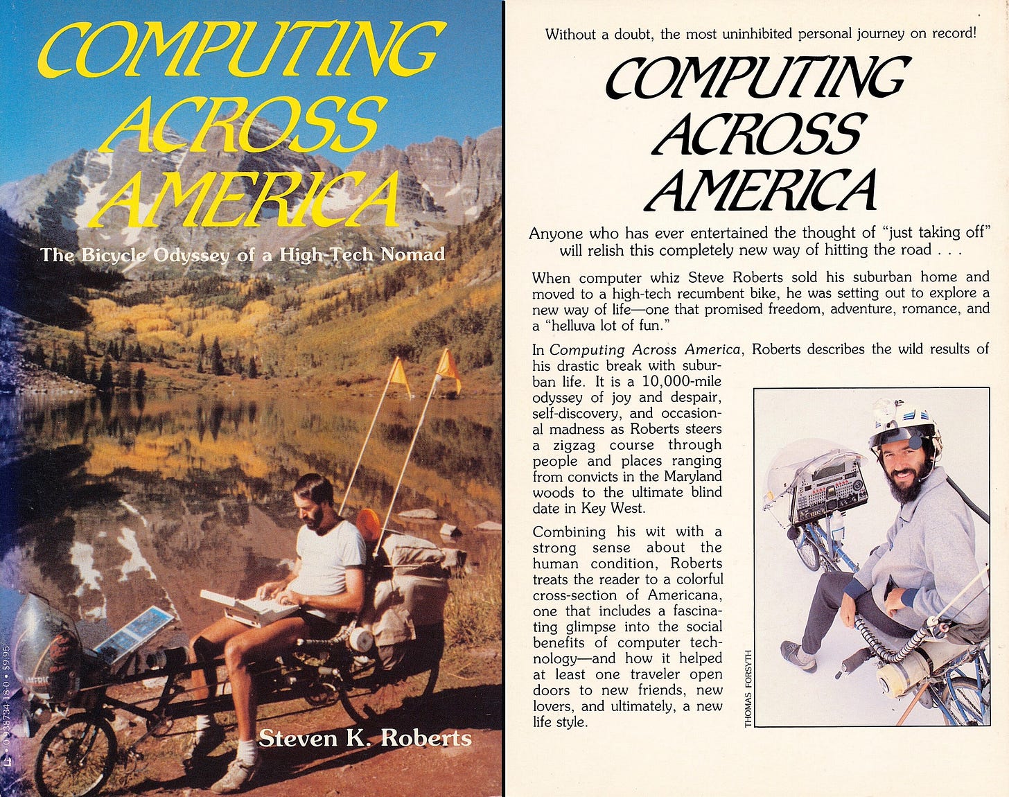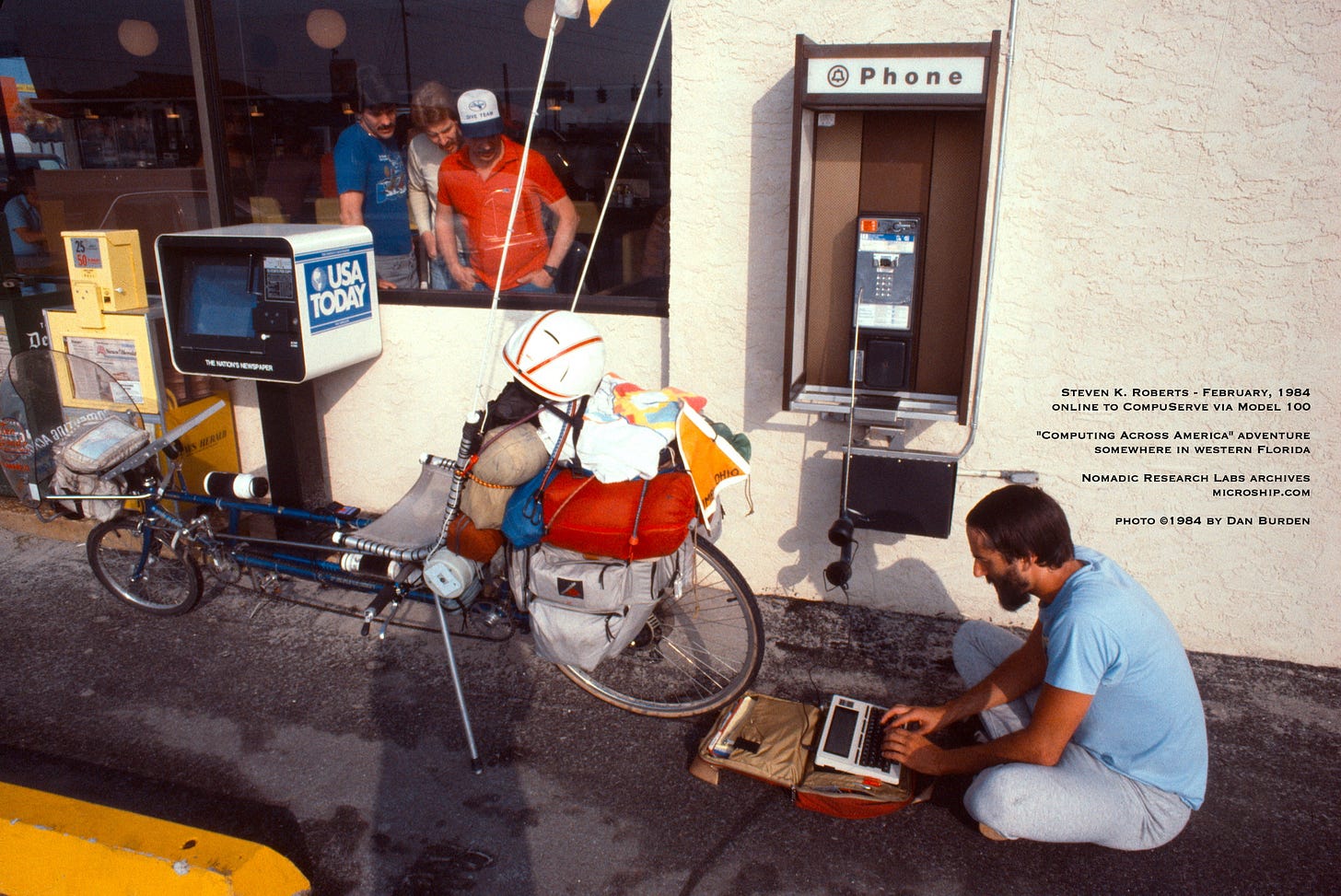 After six months of obsessive preparation, I hit the road in September 1983 on a custom recumbent bicycle with solar-powered laptop, CompuServe account, and a base office. The idea was to use the network to stay in touch with clients and publishers while traveling full time, and as the months passed I refined my tools to render physical location less and less relevant. "Work at home? Work anywhere!" I exuberantly wrote, sensing that I was pedaling on the cusp of major cultural change.