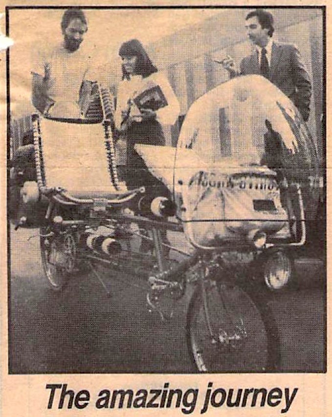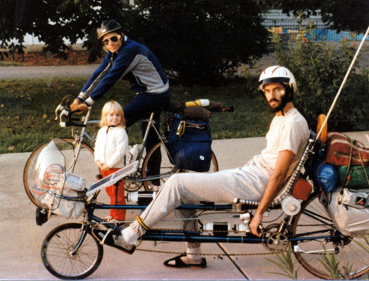 Tech note: this turned out to be prophetic. By 1990, the bike had satellite email at 165 bits per second via console Macintosh, a bird in the Clarke belt, and a Sun workstation at Qualcomm in San Diego.