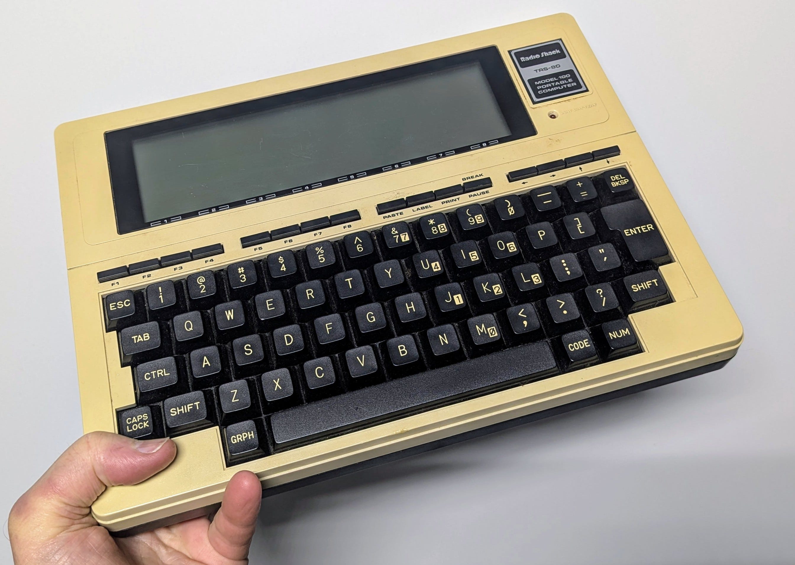 I stepped to the back of the bike, unhooked a few bungee cords, and removed a cordura pack. With a few zips it fell open to reveal the Model 100, which was, at the time, the only lightweight portable computer on the market. There were murmurs and low whistles all around.
